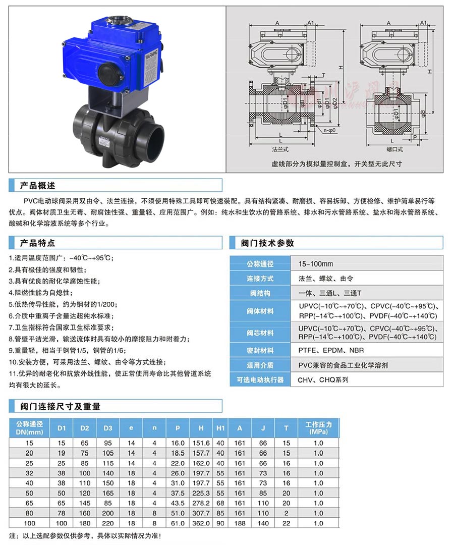 CHQ911F電動塑料球閥采用雙由令、法蘭連接,不須使用特殊工具即可快速裝配。具有結(jié)構(gòu)緊湊、耐磨損、容易拆卸、方便檢修、維護簡單易行等優(yōu)點。閥體材質(zhì)衛(wèi)生無毒、耐腐蝕性強、重量輕、應(yīng)用范圍廣。例如:純水和生飲水的管路系統(tǒng)、排水和污水管路系統(tǒng)、鹽水和海水管路系統(tǒng)、酸堿和化學(xué)溶液系統(tǒng)等多個行業(yè)。