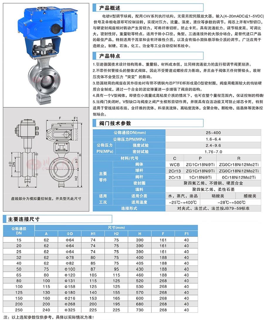 電動對夾式V型球閥配用CHV系列執行機構,無需另配伺服放大器,輸入(4-20mADC或1-5VDC) 信號及單相電源即可控制運轉,實現對壓力、流量、溫度、液位等參數的調節。閥芯上開有V型切口,與硬密封閥座相對轉動產生剪切力,可將纖維切斷,防止卡死。具有流通能力,調節精度高,可調比大,密封性好,重量輕等特點。適用于除小口徑,角型、三通連接外的大部分場合,是替代進口產品的好產品,特別適用于泥漿和含有纖維性介質,以及含有微小固體懸浮物介質的調節。廣泛應用于造紙業,制糖、石油、化工、治金等工業自動控制系統中。