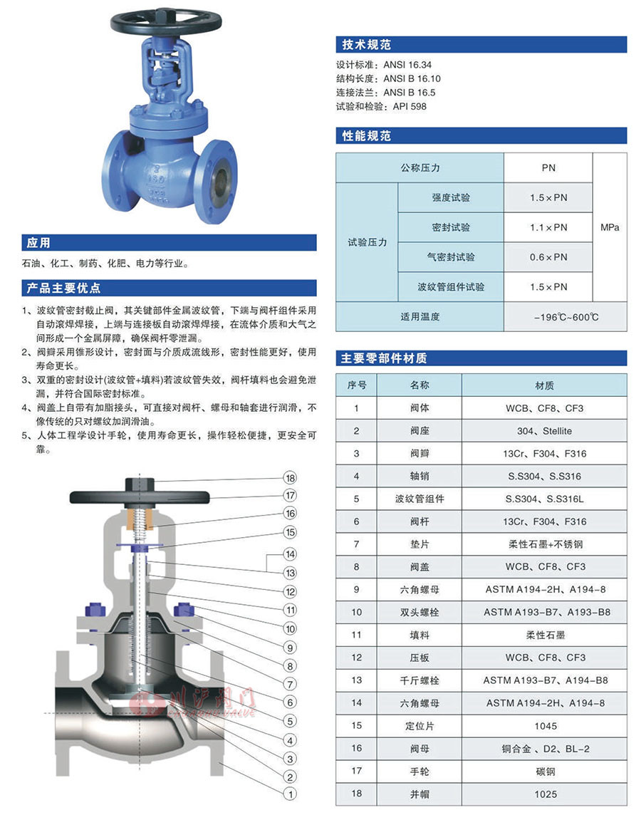 1、波紋管密封截止閥,其關鍵部件金屬波紋管,下端與閥桿組件采用自動滾焊焊接,上端與連接板自動滾焊焊接,在流體介質和大氣之間形成一個金屬屏障,確保閥桿零泄漏。
