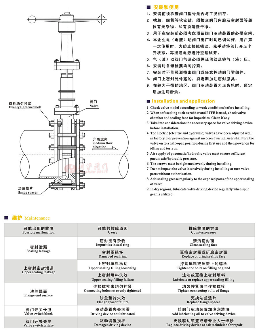 1、刀形漿閘閥按照口徑不同制成暗桿和明桿兩種形式(暗桿DN100~1600mm,明桿DN50~900mm),全圓形的直流通道設計不存渣、不卡阻。刀板底端加工成刀刃狀,對松軟物料如纖維、紙漿、木漿具有切斷功能,同時有良好的開啟和關閉作用。在刀板上端安裝有硬聚四氟乙烯刮泥器,可防止粉塵、沙礫等擦傷性物質進入填料盒,可顯著提高刀板壽命。閥板材質選用不銹鋼、精磨拋光處理可獲得好密封效果。
