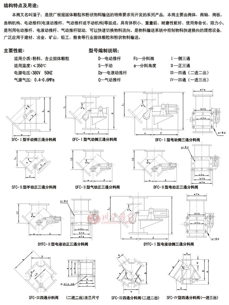 SFC正、側(cè)三通溜子又名叫溜子,是我廠根據(jù)固體顆粒和粉狀物料輸送的特殊要求而開發(fā)的系列產(chǎn)品,本閥主要由閥體、閥軸、閥板、曲柄機構(gòu)、電動推桿(電液動推桿、氣動推桿或手動機構(gòu))等組成。具有體積小、重量輕、耐磨性能好、使用壽命長、阻力小,是利用電動推桿、電液動推桿、氣動推桿驅(qū)動,可以快速切換物料流向。是物料輸送系統(tǒng)中控制物料快速換向的理想設(shè)備,廣泛應用于建材、冶金、礦山、輕工、糧食等行業(yè)固體顆粒和粉狀物料輸送。