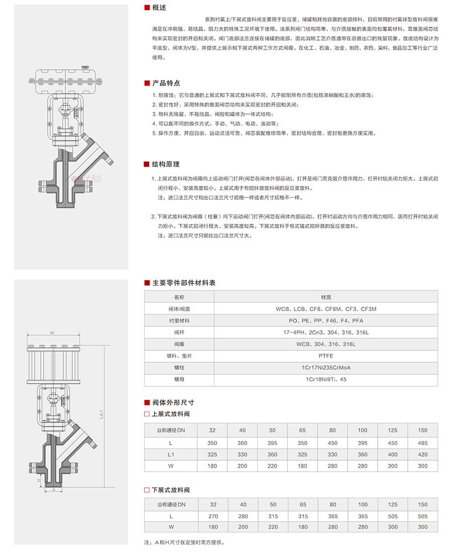 FQ641F46氣動(dòng)薄膜襯氟放料閥襯氟上下展式放料潤主要用于反應(yīng)益、儲罐和其他容器的底部排料,目前常用的襯氟球壁放料閥很灘滿足在沖刷強(qiáng)、易結(jié)品、組力大的特殊工況環(huán)境下使用。該系列閥門結(jié)構(gòu)簡單,與介質(zhì)接觸的表面均包覆氟材料,靠錐面閥芯結(jié)構(gòu)來實(shí)現(xiàn)密封的開啟和關(guān)閉。閥門底部法蘭連接在儲罐的底部,因此消除工藝介質(zhì)通常在容器出口的殘留現(xiàn)象。放底結(jié)構(gòu)設(shè)計(jì)為平底型,閥體為V型,并提供上展示和下展式兩種工作方式閥圈。在化工、石油、治金、割藥、農(nóng)藥、染料、食品加工等行業(yè)廣泛使用。