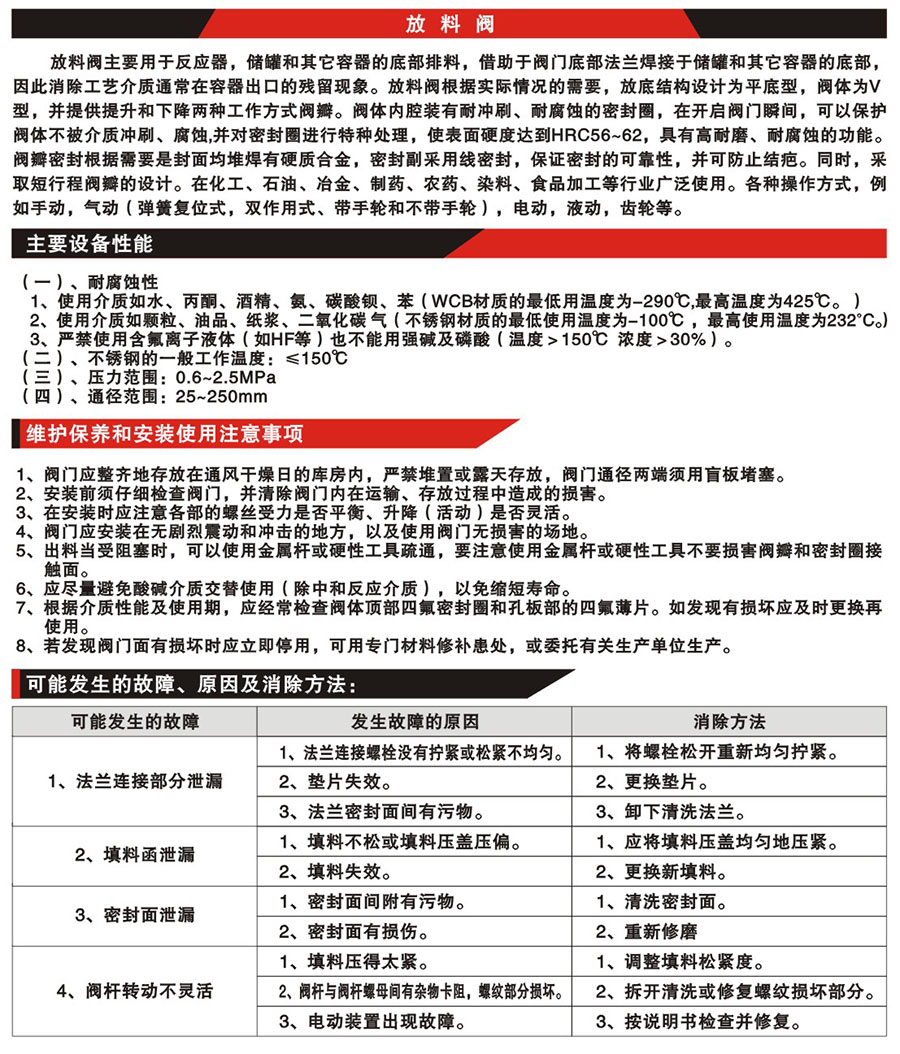 手動上展式放料閥主要用于反應器,儲罐和其它容器的底部排料,借助于閥門底部法蘭焊接于儲罐和其它容器的底部,因此消除工藝介質通常在容器出口的殘留現象。放料閥根據實際情況的需要,放底結構設計為平底型,閥體為V型,并提供提升和下降兩種工作方式閥瓣。閥體內腔裝有耐沖刷、耐腐蝕的密封圈,在開啟閥門瞬間,可以保護閥體不被介質沖刷、腐蝕,并對密封圈進行特種處理,使表面硬度達到HRC56~62,具有高耐磨、耐腐蝕的功能。