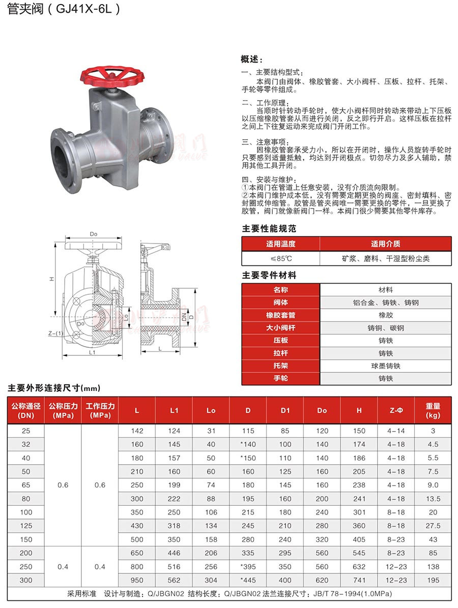 鋁合金管夾閥由閥體、 橡膠管套、 大小閥桿、 壓板、 拉桿、 托架、手輪等零件組成。當順時針轉動手輪時, 使大小閥桿同時轉動來帶動上下壓板以壓縮橡膠管套從而進行關閉, 反之即行開啟。 這樣壓板在拉桿之間上下往復運動來完成閥門開閉工作。