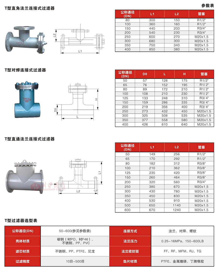 ST型T型過濾器T型過濾器是除去液體中少量固體顆粒的小型設備,可保護設備的正常工作,當流體進入置有一定規格濾網的濾筒后,其雜質被阻擋,而清潔的濾液則由過濾器出口排出,當需要清洗時,只要將可拆卸的濾筒取出,處理后重新裝入即可,因此,使用維護極為方便。