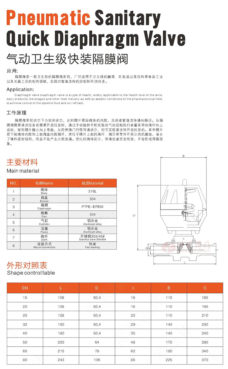 氣動快裝隔膜閥是一款衛(wèi)生型的隔膜閥系列,廣泛適用于衛(wèi)生級的釀酒、乳制品以及飲科等食品工業(yè)以及無菌工況的制藥領域,實現對管道流體的控制和開/關任務。