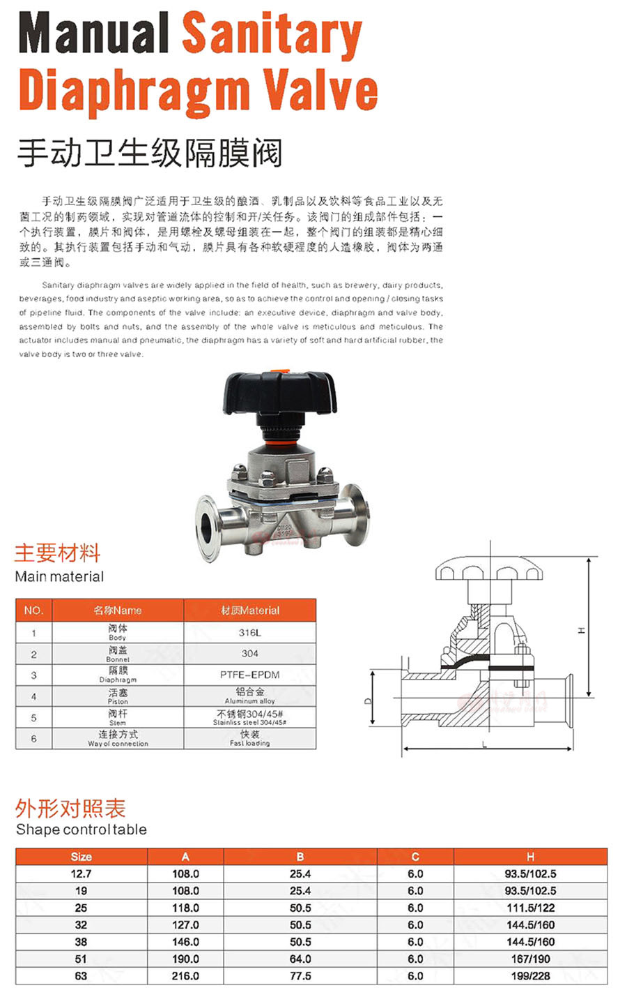 手動快裝隔膜閥廣泛適用于衛生級的釀酒、乳制品以及飲料等食品工業以及無菌工況的制藥領域,實現對管道流體的控制和開/關任務。該閥門的組成部件包括:一個執行裝置,膜片和閥體,是用螺栓及螺母組裝在一起,整個閥門的組裝都是精心細致的。其執行裝置包括手動和氣動,膜片具有各種軟硬程度的人造橡膠,閥體為兩通或三通閥。