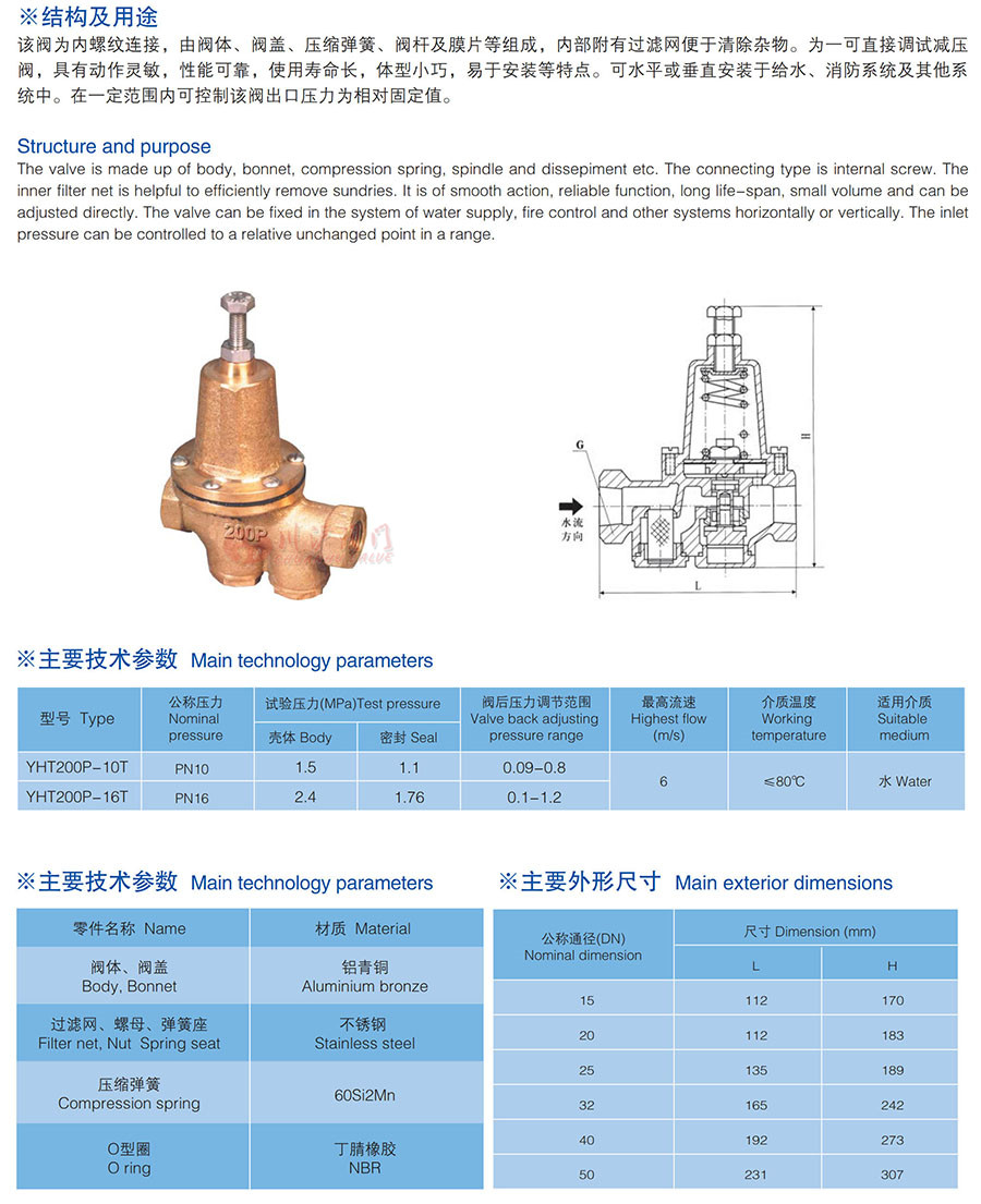 200P減壓閥為內(nèi)螺紋連接,由閥體、閥蓋、壓縮彈簧、閥桿及膜片等組成,內(nèi)部附有過(guò)濾網(wǎng)便于清除雜物。為一可直接調(diào)試減壓閥,具有動(dòng)作靈敏,性能可靠,使用壽命長(zhǎng),體型小巧,易于安裝等特點(diǎn)??伤交虼怪卑惭b于給水、消防系統(tǒng)及其他系統(tǒng)中。在一定范圍內(nèi)可控制該閥出口壓力為相對(duì)固定值。