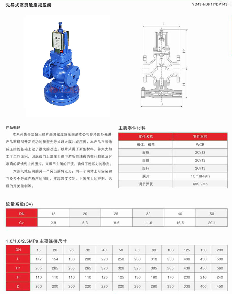 DP17高靈敏度蒸汽減壓閥是先導(dǎo)式超大膜片高靈敏度減壓閥是本公司參考國外先進(jìn)產(chǎn)品而研制開發(fā)成功的新型先導(dǎo)式超大膜片減壓閥,本產(chǎn)品在普通減壓閥的基礎(chǔ)上做了很大的改進(jìn)。膜片采用了新型材料,并大大加工了工作面積,因此閥門上游壓力或下游負(fù)荷細(xì)微的變化都能及時準(zhǔn)確的反饋到主閱膜片,來調(diào)節(jié)主閥的開度,確保下游壓力的穩(wěn)定。