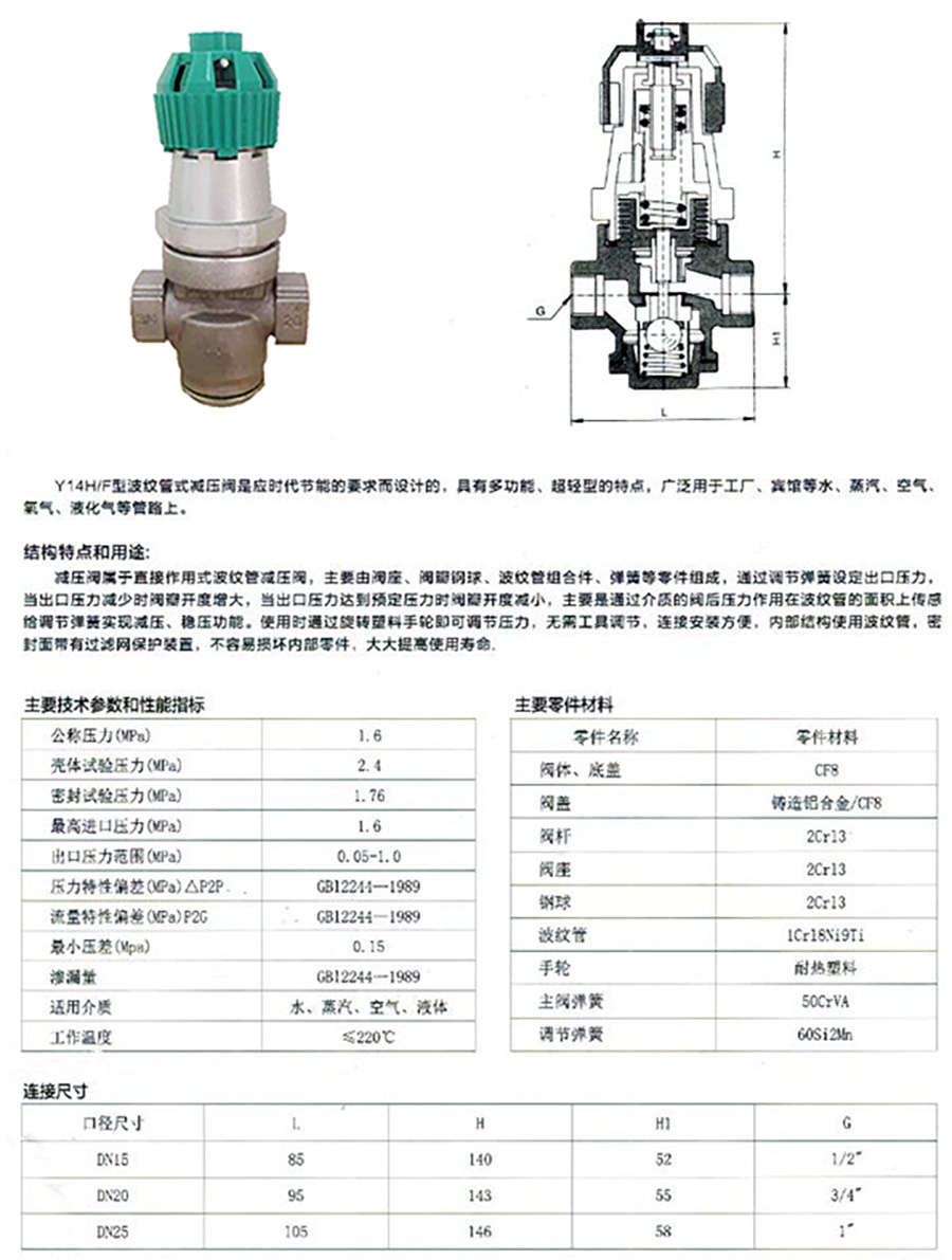 Y14H波紋管減壓閥是應時代節能的要求而設計的,具有多功能、超輕型的特點,廣泛用于工廠、賓館等水、蒸汽、空氣、氧氣、液化氣等管路上。