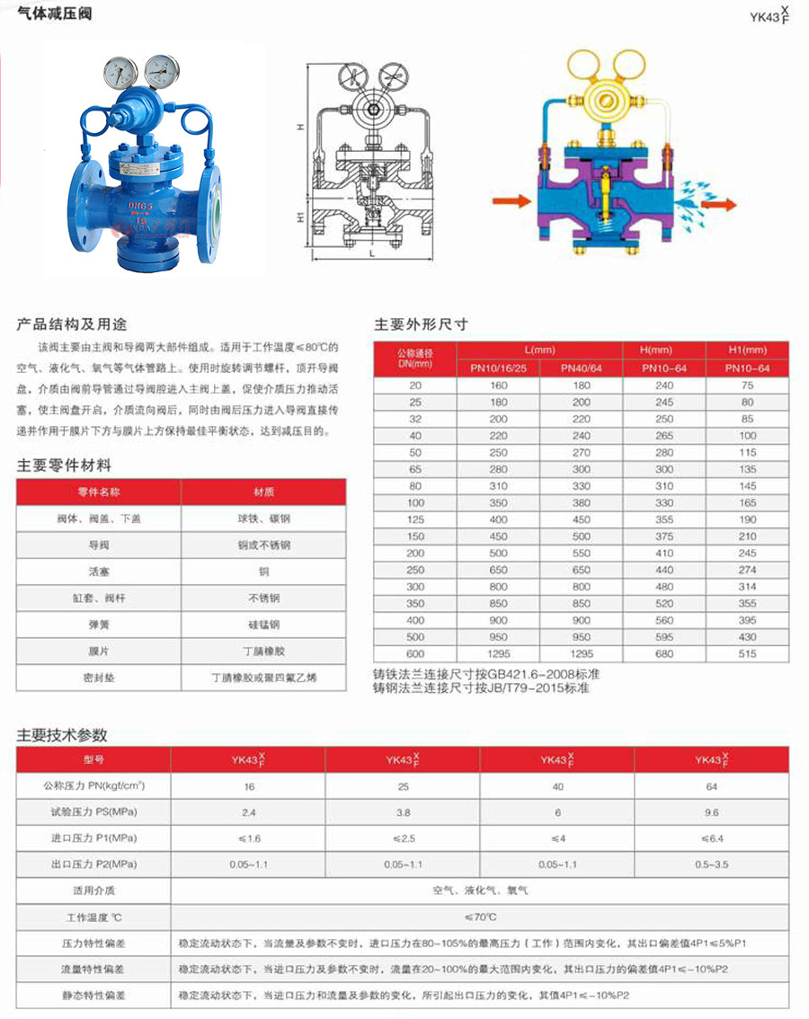 YK43X/F氣體減壓閥主要由主閥和導兩大部件組成。適用于工作溫度≤150℃的空氣、液化氣、氯氣等氣體管路上。使用時旋轉調節螺桿,項開導閥盤.介質由閥前導管通過導閥腔進入主閥上蓋,促使介質壓力推動活富,使主閥盤開啟,介質流向閥后,同時由閥后壓力進入導閥直接傳遞并作用于膜片下方與膜片上方保持好平衡狀態,達到減壓目的。