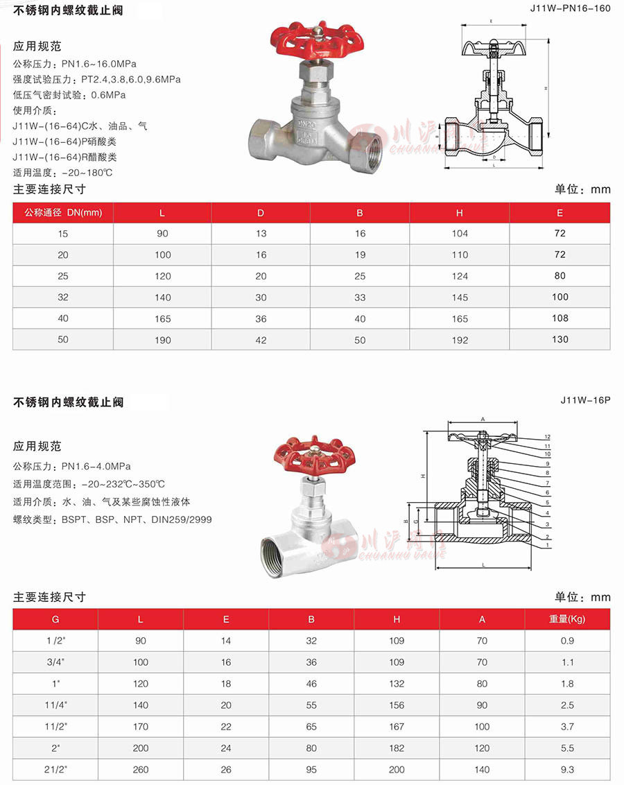 J11W內螺紋截止閥產品參數: 公稱壓力:PN1.6~16.0MPa