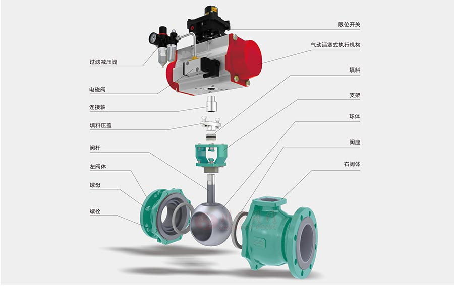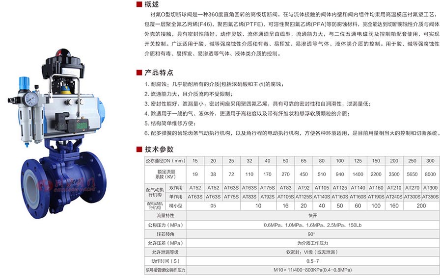 氣動襯氟法蘭球閥是一種360度直角回轉的高級切斷閥,在與流體接觸的閥體內壁和閥內組件均果用高溫模壓襯氟塑工藝,包覆一層聚全氟乙丙烯(F46)、聚四氟乙烯(PTFE)、可溶性聚四氟乙烯(PFA)等防腐蝕材料,完全能達到切斷腐蝕性介質與閥體外殼的接觸,具有密封性能好,動作靈敬、流體通遞呈直線型,流通能力大,與二位五通電磁閥及控制箱配套使用,可實現開關控制。廣泛適用于酸、堿等強腐蝕性介質和有毒、易揮發、易滲透等氣體、液體類介質的控制。用于酸、堿等強腐蝕性介質和有毒、易揮發、易滲透等氣體、液體類介質的控制。