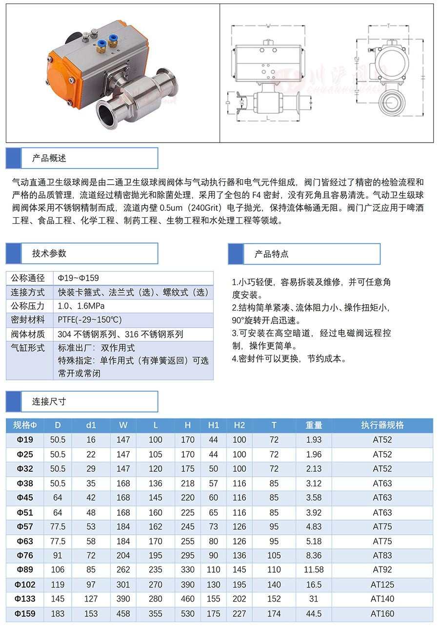 氣動(dòng)直通衛(wèi)生級(jí)球閥是由二通衛(wèi)生級(jí)球閥閥體與氣動(dòng)執(zhí)行器和電氣元件組成,閥門(mén)皆經(jīng)過(guò)了精密的檢驗(yàn)流程和嚴(yán)格的品質(zhì)管理,流道經(jīng)過(guò)精密拋光和除菌處理,采用了全包的F4密封,沒(méi)有死角且容易清洗。氣動(dòng)衛(wèi)生級(jí)球閥閥體采用不銹鋼精制而成,流道內(nèi)壁0.5um(240Grit)電子拋光,保持流體暢通無(wú)阻。閥門(mén)廣泛應(yīng)用于啤酒工程、食品工程、化學(xué)工程、制藥工程、生物工程和水處理工程等領(lǐng)域。