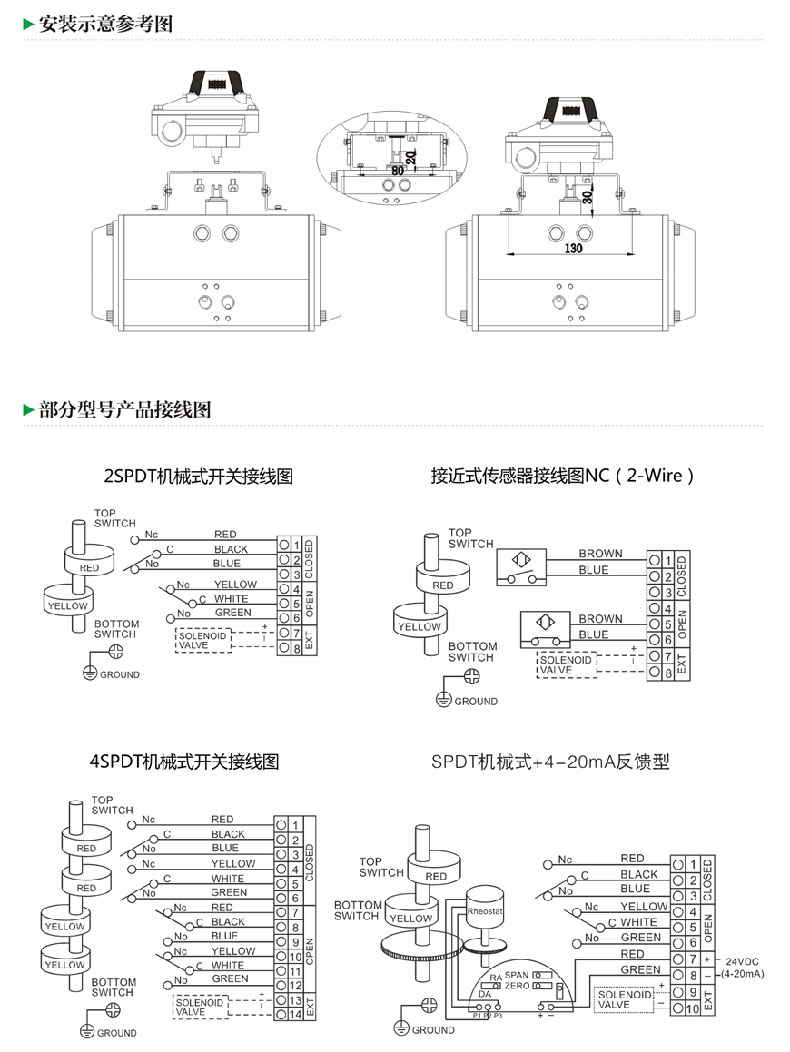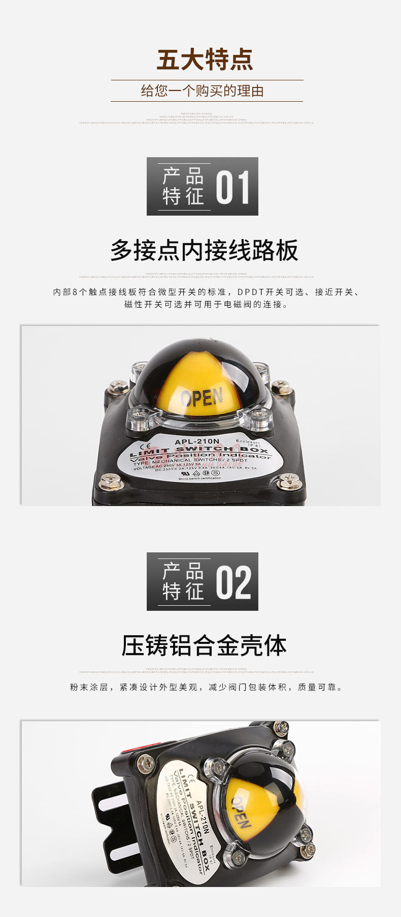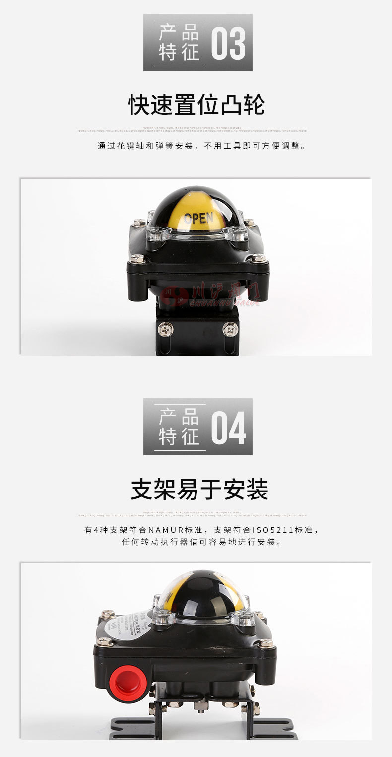 限位開關(guān)是作用于氣缸上的一種反饋附件,內(nèi)部8個(gè)觸點(diǎn)接線板符合微型開關(guān)的標(biāo)準(zhǔn),DPDT開關(guān)可選、接近開關(guān)、磁性開關(guān)可選并可用于電磁閥的連接。限位開關(guān)采用壓鑄鋁合金殼體,粉末涂層,緊湊設(shè)計(jì)外型美觀,減少閥門包裝體積,質(zhì)量可靠。