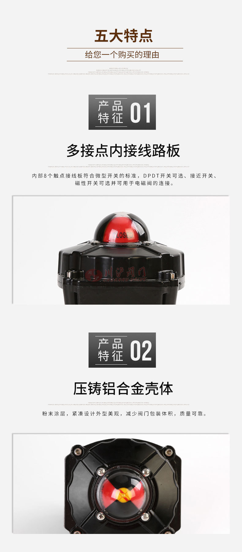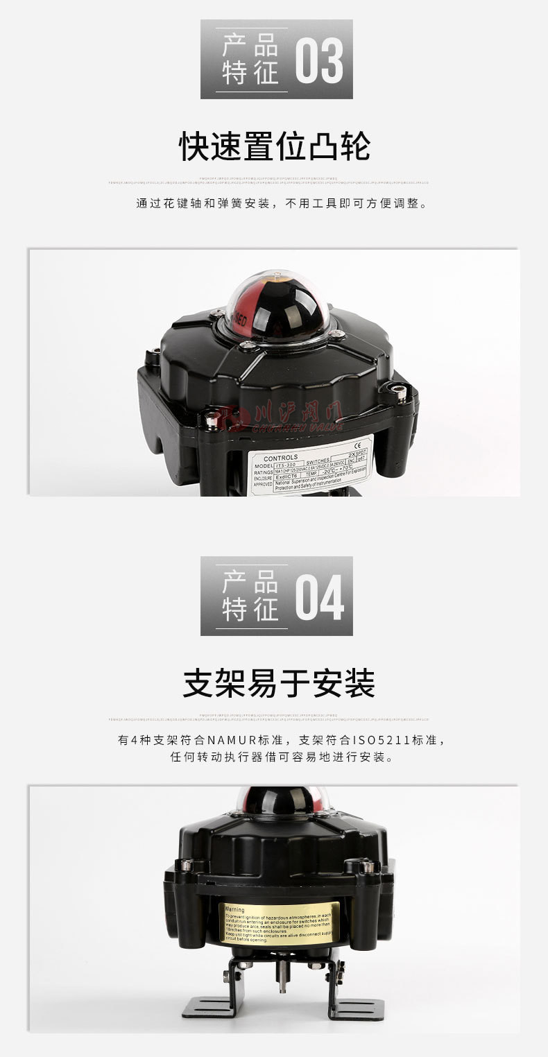 防爆型限位開關是作用于氣缸上的一種反饋附件,內部8個觸點接線板符合微型開關的標準,DPDT開關可選、接近開關、磁性開關可選并可用于電磁閥的連接。防爆型限位開關采用壓鑄鋁合金殼體,粉末涂層,緊湊設計外型美觀,減少閥門包裝體積,質量可靠。