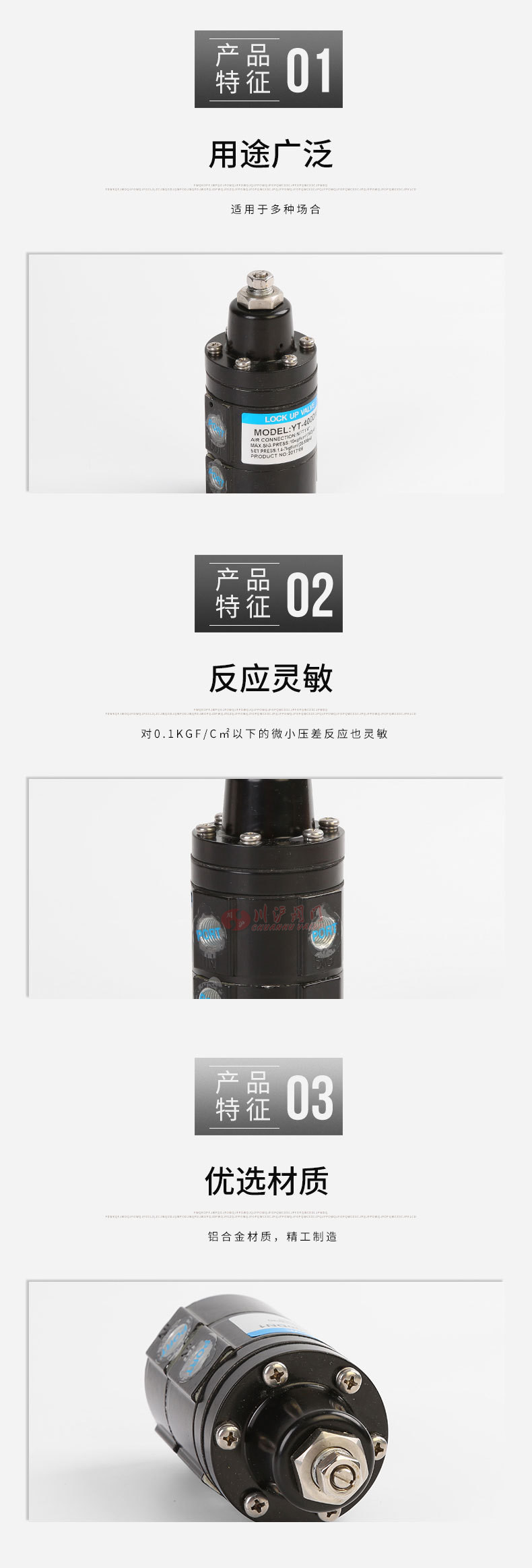 YT-400D氣動保位閥是作用于氣動流程控制系統中,氣源或供氣配管管路發生故障,致使供給空氣發生異常時,鎖定閥,可以此作為動作的基準信號,立即自動鎖住,直至恢復到正常狀態為止,但保持操作部原有位置不變。YT-400S是單作用氣動保位閥、YT-400D是雙作用氣動保位閥