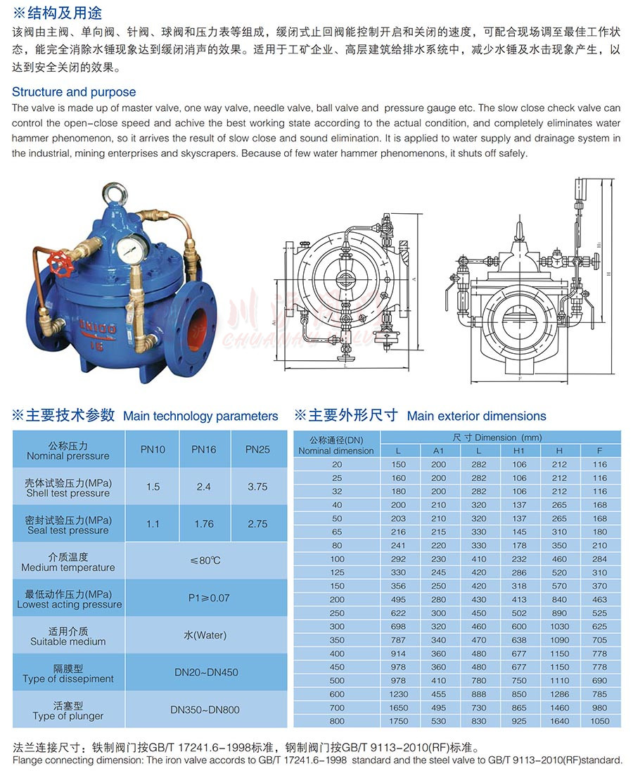 300X緩閉止回閥由主閥、單向閥、針閥、球閥和壓力表等組成,緩閉式止回閥能控制開啟和關閉的速度,可配合現場調至好工作狀態,能完全消除水錘現象達到緩閉消聲的效果。適用于工礦企業、高層建筑給排水系統中,減少水錘及水擊現象產生,以達到安全關閉的效果。