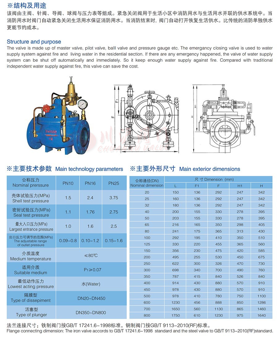 900X緊急關閉閥由主閥、針閥、導閥、球閥與壓力表等組成。緊急關閉閥用于生活小區中消防用水與生活用水并聯的供水系統中。當消防用水時閥門自動緊急關閉生活用水保證消防用水。當消防結束時,閥門自動打開恢復生活供水。比傳統的消防單獨供水更能節約成本。