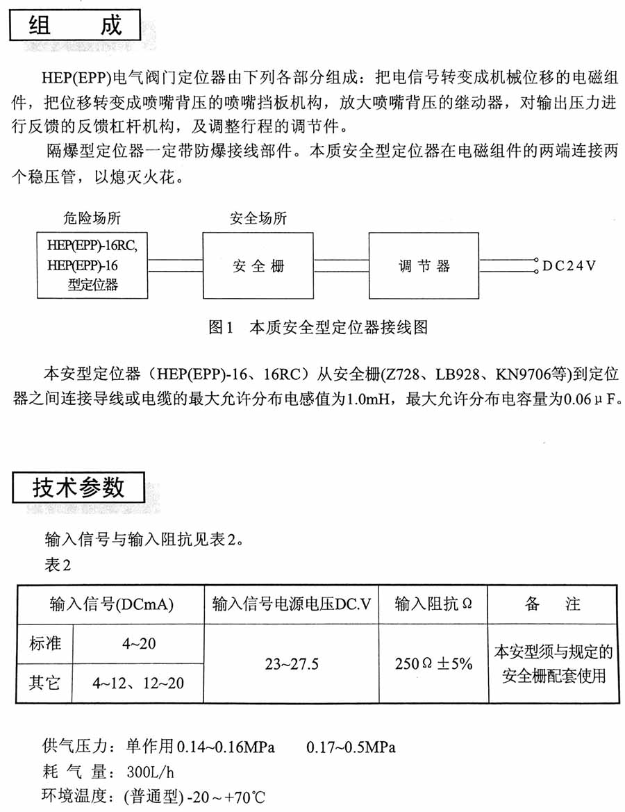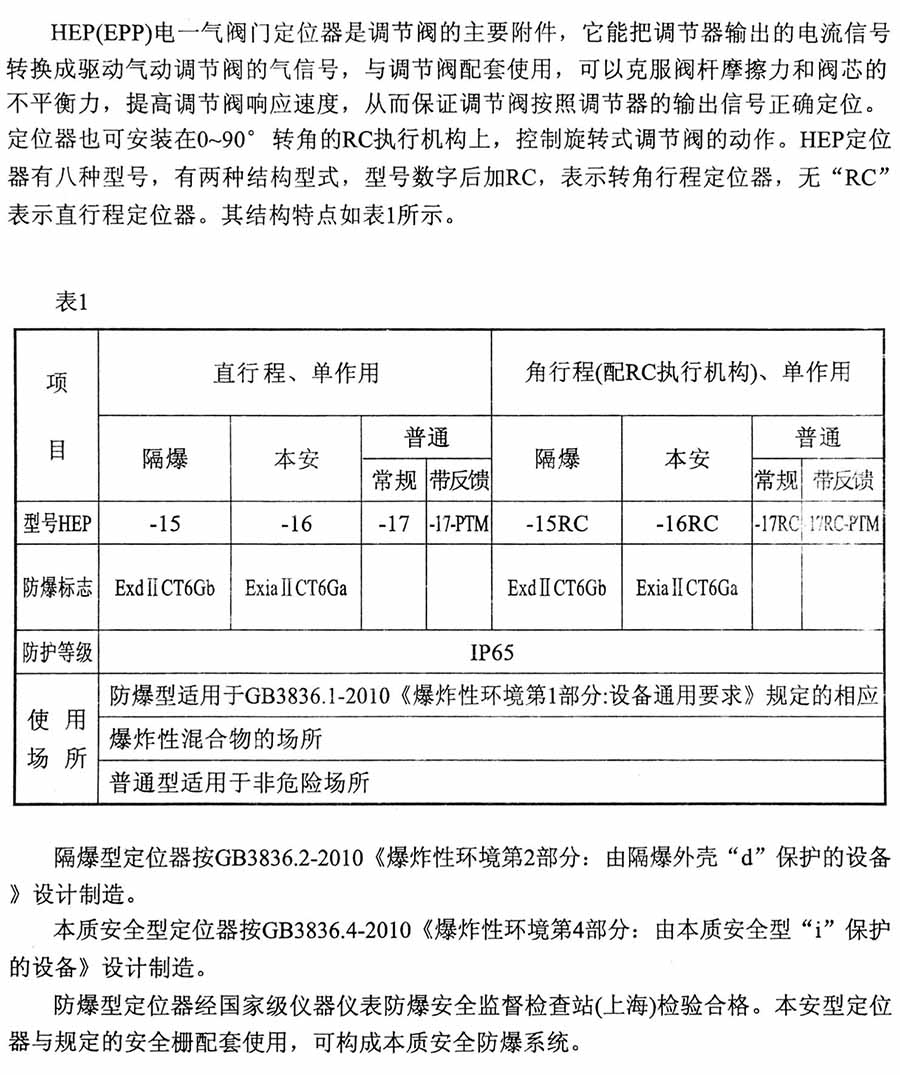 HEP(EPP)電一氣閥門定位器是調(diào)節(jié)閥的主要附件,它能把調(diào)節(jié)器輸出的電流信號轉(zhuǎn)換成驅(qū)動氣動調(diào)節(jié)閥的氣信號,與調(diào)節(jié)閥配套使用,可以克服閥桿摩擦力和閥芯的不平衡力,提高調(diào)節(jié)閥響應(yīng)速度,從而保證調(diào)節(jié)閥按照調(diào)節(jié)器的輸出信號正確定位。定位器也可安裝在0~90°轉(zhuǎn)角的RC執(zhí)行機(jī)構(gòu)上,控制旋轉(zhuǎn)式調(diào)節(jié)閥的動作。HEP定位器有八種型號,有兩種結(jié)構(gòu)型式,型號數(shù)字后加RC,表示轉(zhuǎn)角行程定位器,無“RC”表示直行程定位器。
