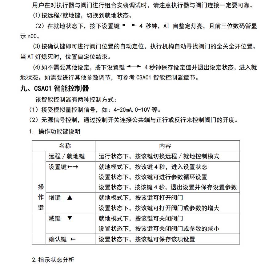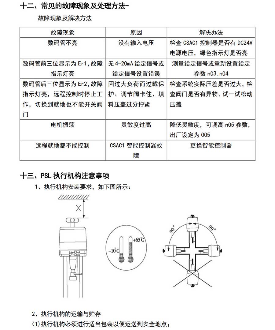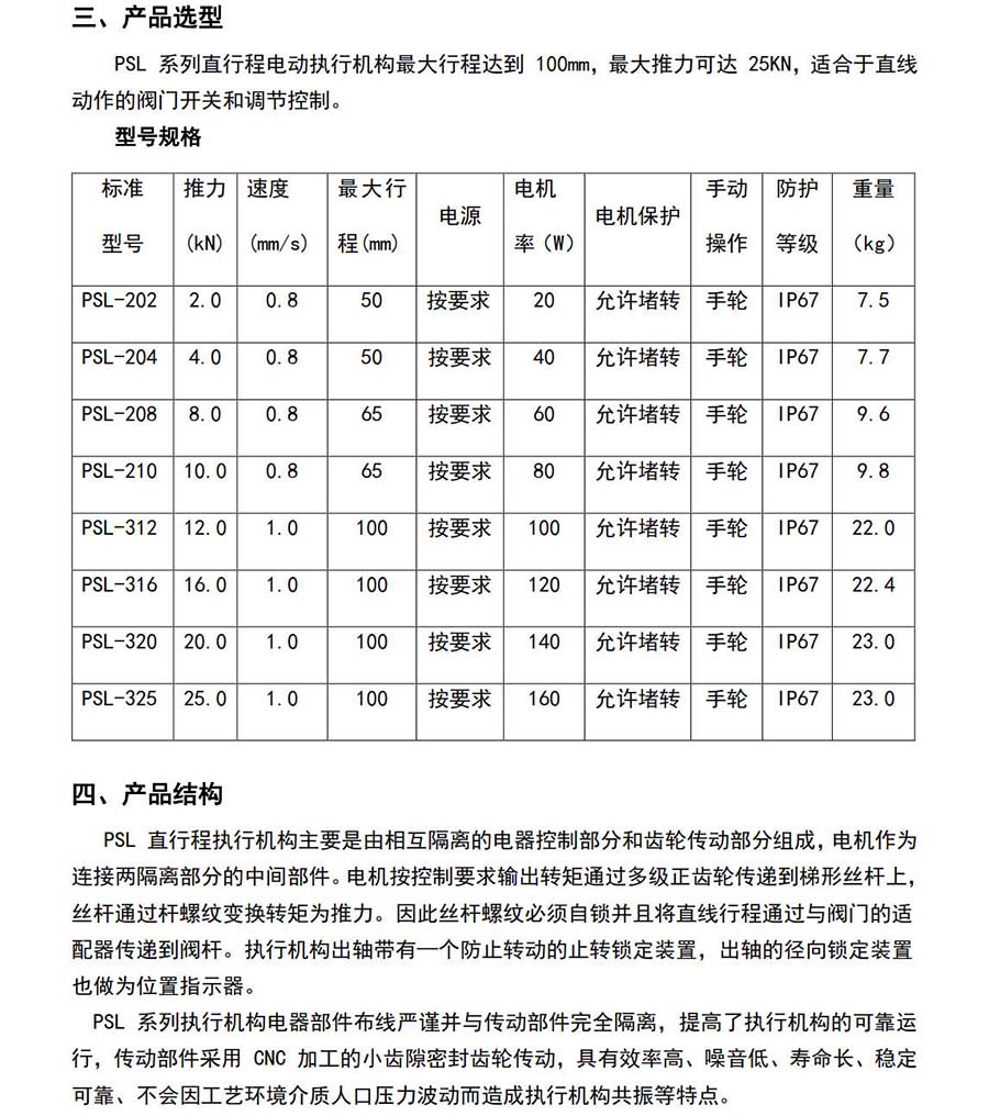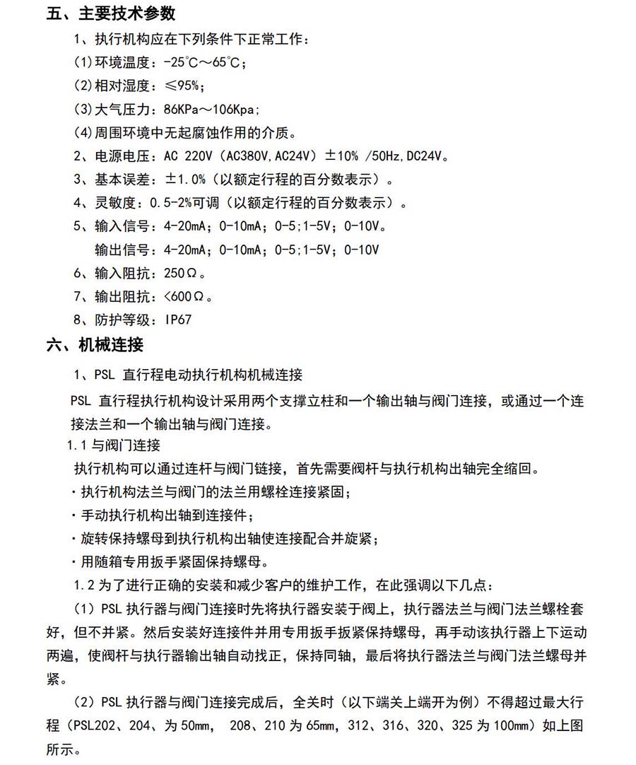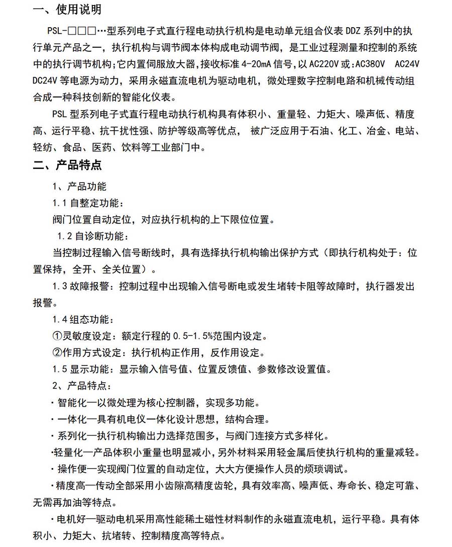 PSL-XXX型系列電子式直行程電動執行機構是電動單元組合儀表DDZ系列中的執行單元產品之一,執行機構與調節閥本體構成電動調節閥,是工業過程測量和控制的系統中的執行調節機構;它內置伺服放大器,接收標準4-20mA信號,以AC220V或:AC380V AC24V DC24V等電源為動力,采用永磁直流電機為驅動電機,微處理數字控制電路和機械傳動組合成一種科技創新的智能化儀表