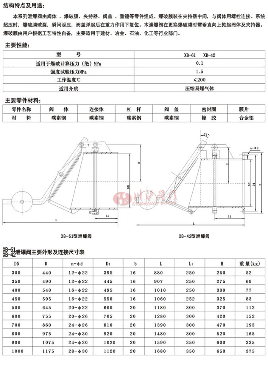 XB42/XB61泄爆閥由閥體、爆破膜、夾持器、閥蓋、重錘等零件組成。爆破膜裝在夾持器中間,與閥體用螺栓連接。系統(tǒng)超壓時(shí),爆破膜破裂,瞬間泄壓,閥蓋彈起后在重力作用下復(fù)位。本泄爆閥在更換爆破膜時(shí)需垂直向上掀起閥體及夾持器。