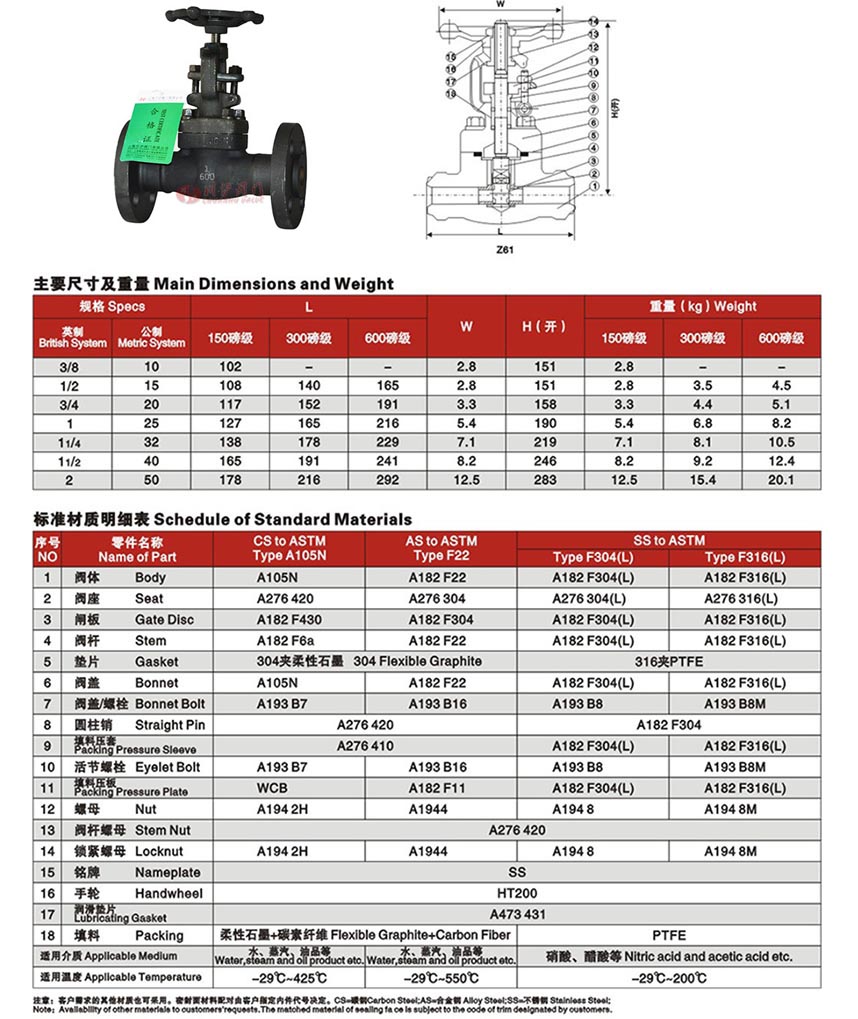 閥體材質(zhì):A105N、F22、F304不銹鋼系列、F316不銹鋼系列