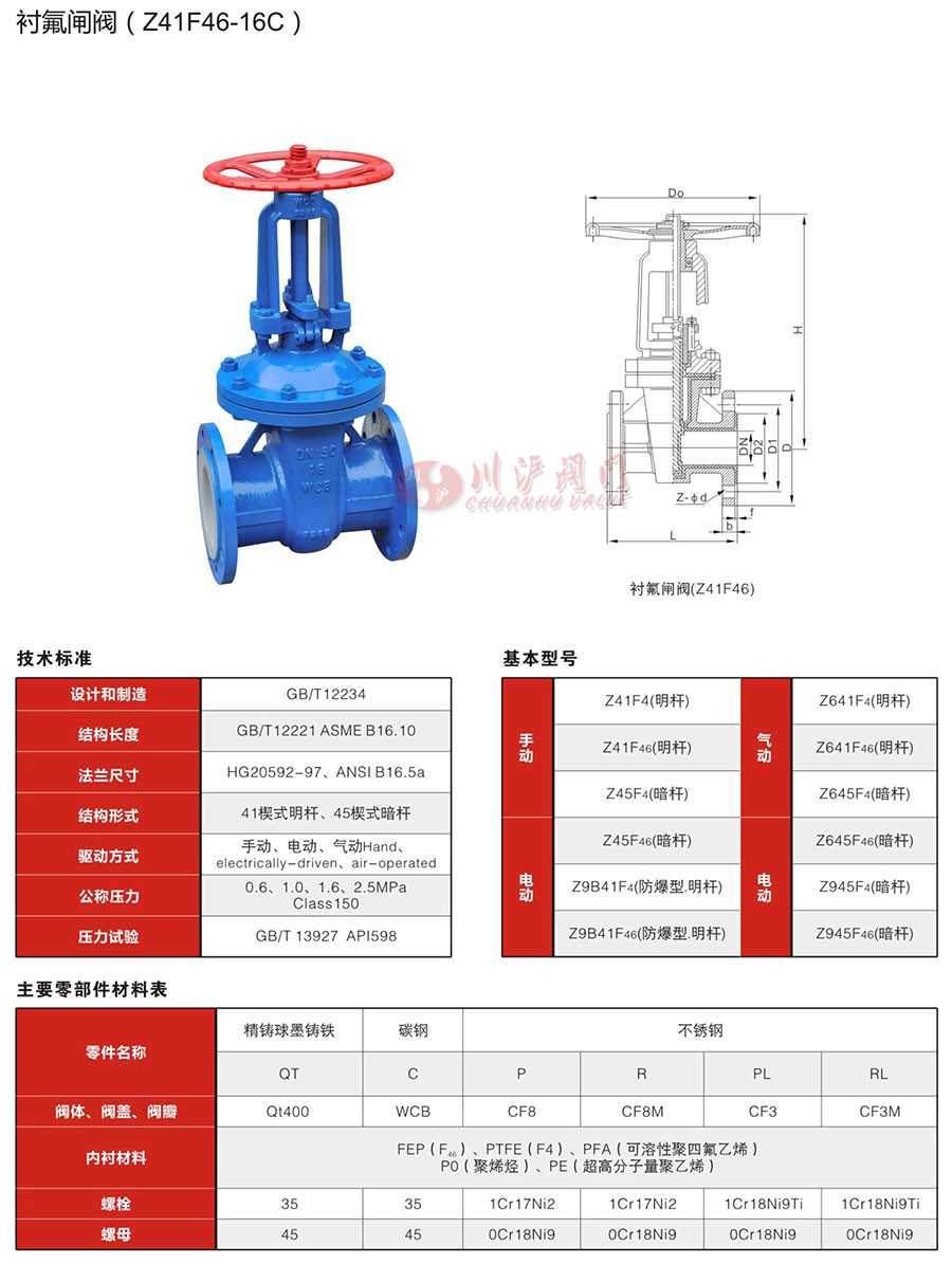 Z41F46/Z41J襯氟襯膠閘閥又稱氟塑料襯里耐腐閘閥,是將聚四氟乙烯樹脂(或型材經加工)采用模壓(或鑲嵌)方法置于鋼質或鐵質的閘閥承壓件的內壁(同樣的方法適用于各類壓力容器及管路附件的內襯)或閘閥內件的外表面,利用其在抗強腐蝕介質方面的獨特性能制做成各類閥門。襯氟閘閥的啟閉件是閘板,閘板的運動方向與流體方向相垂直,閘閥只能作全開和全關,不能作調節和節流。