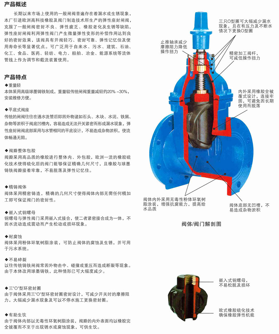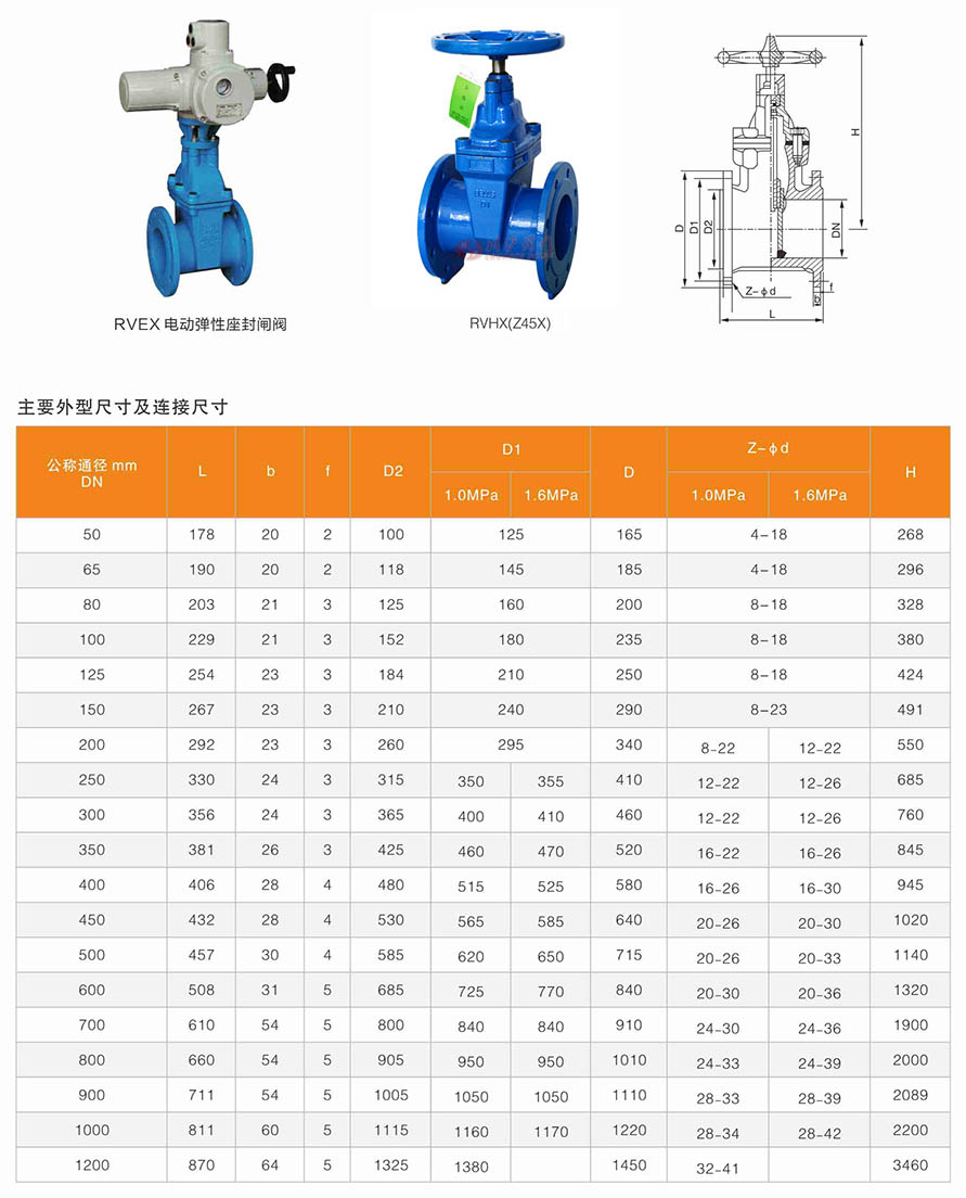 RHVX/Z45X彈性軟密封閘閥,長期以來市場上使用的一般閘閥普遍存在著漏水或生銹現象,上海川滬閥門引進歐洲高科技橡膠及閥門制造技術所生產的彈性座封閘閥,克服了一般閘閥密封不良、彈性疲乏、橡膠老化及生銹等缺陷,彈性座封閘閥利用彈性閥門產生微量彈性變形的補償作用達到良好的密封效果,該閥具有開閥輕巧、密封可靠、彈性記憶佳及使用壽命長等顯著優點。可廣泛用于自來水、污水、建筑、石油、化工、食品、醫藥、輕紡、電力、船舶、冶金、能源系統等流體管線上作為調節和截流裝置使用。