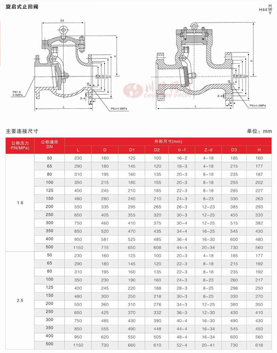 H44W/H44H旋啟式止回閥適用于石油、化工、制藥、化肥、電力行業等各種工況的管路上,適用介質為水、油品、蒸汽、酸性介質等。是控制管道內介質單向流向的閥門,用來防止管路中的介質倒流。止回閥屬于自動閥類,啟閉件靠流動介質的力量自行開啟或關閉。降式止回閥只用于介質單向流動的管路上,阻止介質回流,以防發生事故。