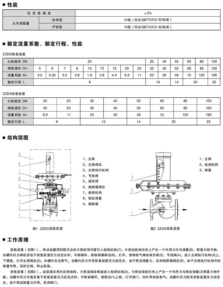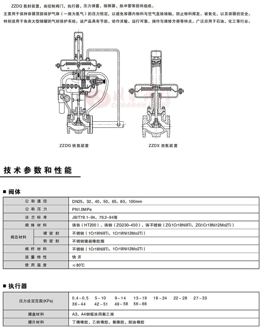 ZZDQ氮封裝置,由控制閥門、執行器、壓力彈簧、指揮器、脈沖管等部件組成。分為ZZDG供氮裝置(帶指揮器自力式壓力調節閥)和ZZDX泄氮裝置(自力式微壓閥調節閥)。主要用于保持容器頂部保護氣體(一般為氮氣)的壓力恒定,以避免容器內物料與空氣直接接觸,防止物料揮發、被氧化,以及容器的安全。特別適用于各類大型儲罐的氣封保護系統。該產品具有節能、動作靈敏、運行可靠、操作與維修方便等特點。廣泛應用于石油、化工等行業。