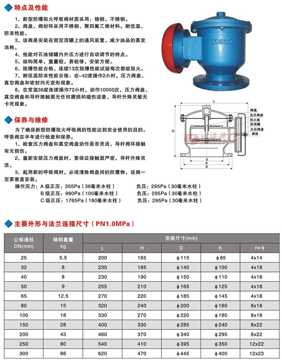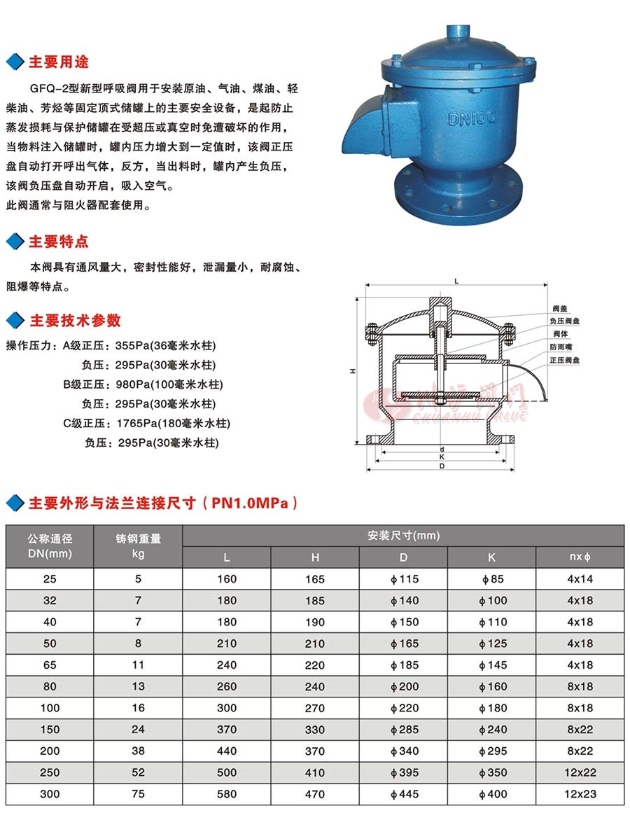 GFQ型呼吸閥用于安裝原油、氣油、煤油、輕柴油、芳烴等固定頂式儲罐上的主要安全設備,是起防止蒸發損耗與保護儲罐在受超壓或真空時免遭破壞的作用,當物料注入儲罐時,罐內壓力增大到一定值時,該閥正壓盤自動打開呼出氣體,反方,當出料時,罐內產生負壓,該閥負壓盤自動開啟,吸入空氣。此閥通常與阻火器配套使用。在此基礎上,上海川滬閥門公司開發了ZFQ防爆阻火呼吸閥系列,具體見下面參數